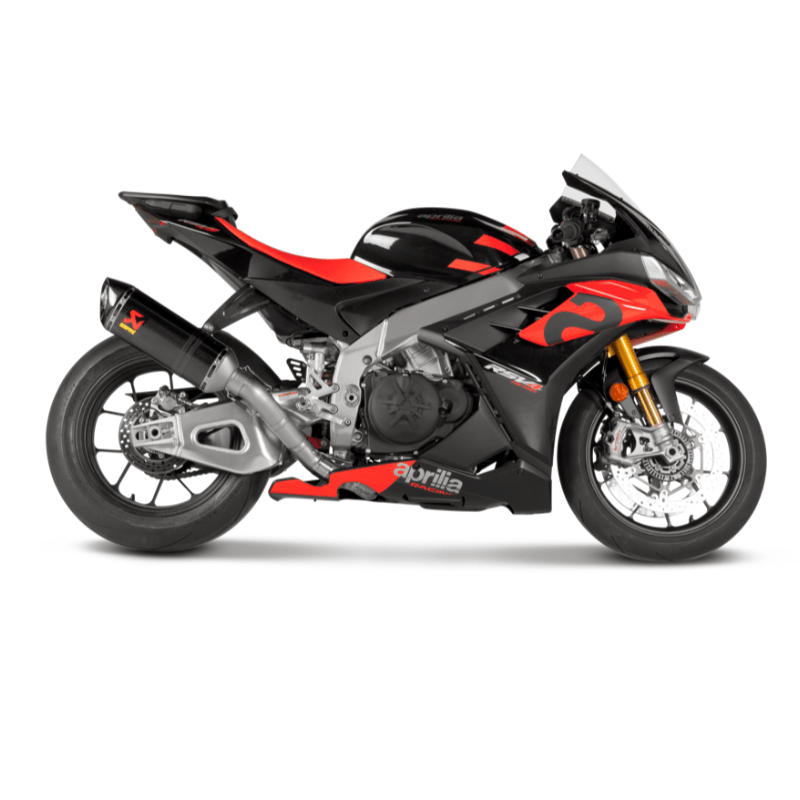 The combination of race-proven, lightweight materials, exceptional production quality, perfect design, amazing sound, and top performance makes this exhaust a must-have for discerning riders that demand the best. It is constructed with a carbon-fibre muffler outer sleeve and end cap, with a fully titanium link pipe and inner muffler structure, matched to high-grade titanium alloy for the headers and collectors, resulting in a full system that is 44% lighter than stock. Developed for use on closed-course competition circuits, this racing track–oriented system requires mandatory remapping and removal of the passenger footrest. It delivers increases of power and torque of 4.0 kW (5.4 hp) at 13,000 rpm and 3.8 Nm at 7,700 rpm when measured in back-to-back comparisons against an Aprilia RSV4 with a standard stock system on the in-house dyno. This race-developed system delivers a distinctive deep, sporty sound, perfectly endorsing the Akrapovič character.