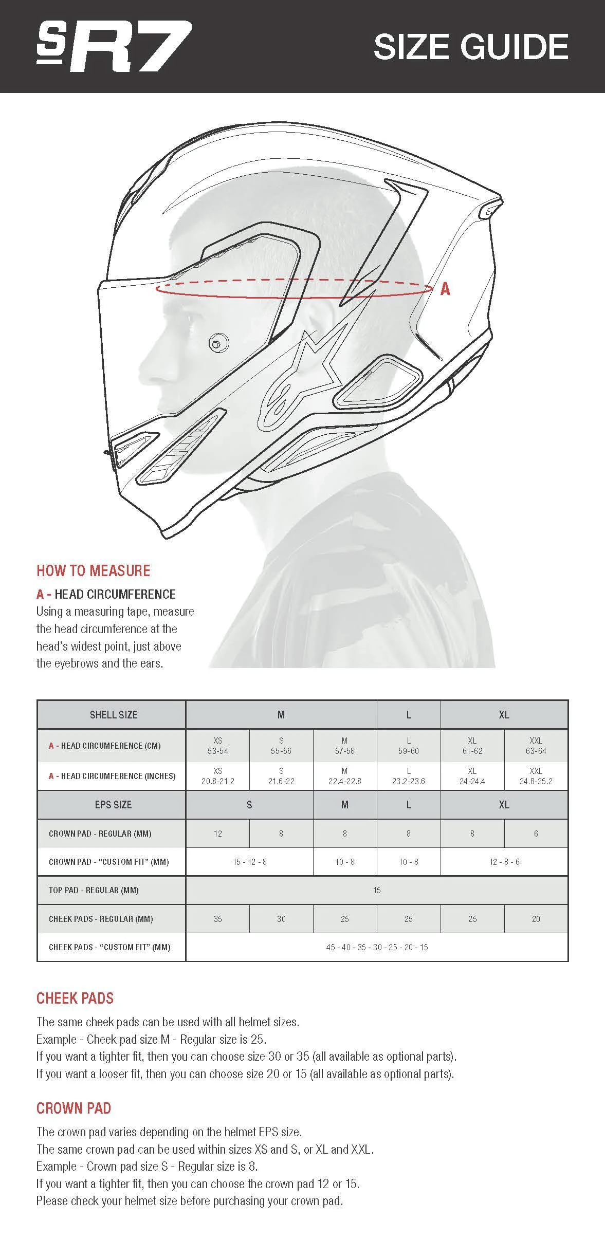- The S-R7 features Alpinestars’ unique and patented A-Head fitment system, allowing riders to fine-tune both the height and angle at which the helmet sits on the head. A micro-adjustable pad connected to the helmet’s inner EPS liner enables an ultra-specific setup that adapts to how deeply the rider’s head sits in the helmet and how far forward or backward it is tilted, delivering the ultimate personalized fit.
