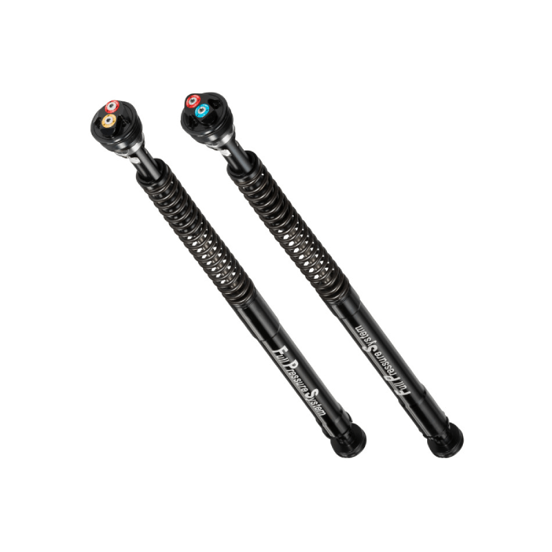 FPS: Full Pressure System exhibits the highest efficiency and practicality of this patented system. This innovative damping system provides immediate damping, while avoiding any cavitations of the internal fluid. The system is gas pressurized at low pressure. The cartridges are asymmetric: one controls compression, the other controls rebound. With two alternate chambers at both ends, it is possible to create high damping force even at very low speed.