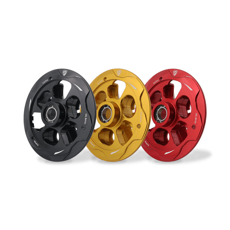 Pressure plate dedicated to oil bath clutch Ducati, made in light alloy, machined from solid and then anodized.