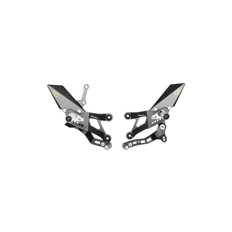 They are adjustable in height and backwards, offering multiple footpeg positions, which can be implemented with the aid of optional footpeg holders. Up to 3 high-quality bearings are integrated into the levers to withstand the most extreme stresses on the road, but especially on the track. The rearsets can be customized thanks to a wide range of accessories and spare parts.