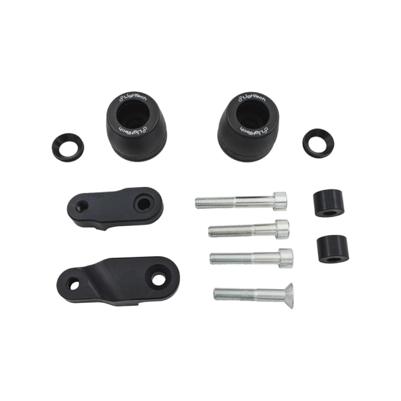 LighTech frame protectors were created with the aim of protecting the fairing, the engine and other parts of the motorbike from possible impacts or damage. Every single component has been studied and developed to increase the protection factor, also thanks to the particular materials used: the upper ring is produced in aluminium, a very resistant material but, at the same time, very light; the oscillation bush is made of magnesium, the shell silk-screened with the Lightech logo laser-branded in nylon; the shock-absorber rubber in TPE, hardness 60 Shore and the magnesium bottom. LighTech frame protectors are supplied with everything needed for assembly (including pins and spacers). The standard configuration is supplied with BLACK aluminum rings and BLACK anti-shock rubbers, but it is possible to customize the LighTech frame protectors by purchasing rings and rubbers in other colors separately.