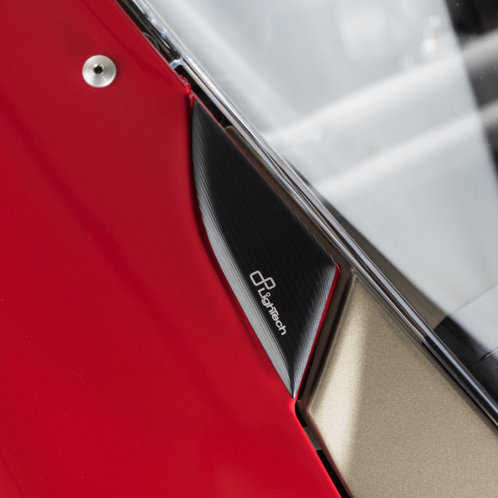 The LighTech mirror block-off plates perfectly cover the holes of the original mirrors when they are removed, in a very elegant and harmonious way. They are produced in an aluminum alloy, which combines long-term resistance with the lightness sought by pilots when riding. They are also ideal for use on the track without mirrors. To make the product more authentic and original, the LighTech logo is laser engraved on each mirror cap. The shape of each mirror cap changes to better adapt to the design of the motorcycle. The screws for installing the product are included in the package.