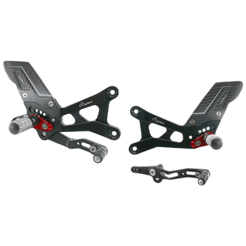 Lightech”s rearsets are made of Ergal 7075-T6 machined from solid. The main support is made of a single block, resulting in a more resistant structure and exceptional rigidity that transmits a greater driving feeling to the rider. They are adjustable in height and backwards, offering multiple footpeg positions, which can be implemented with the aid of optional footpeg holders. Up to 3 high-quality bearings are integrated into the levers to withstand the most extreme stresses on the road, but especially on the track. The rearsets can be customized thanks to a wide range of accessories and spare parts.