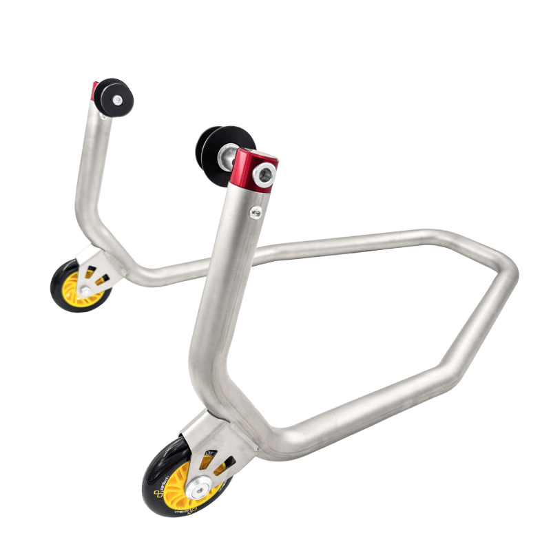 The Lightech stainless steel rear stand is the perfect combination of aesthetics and quality. It guarantees minimal effort to lift the motorcycle and is very practical. It has Lightech branded wheels and red anodized inserts. The photo shows the version with rollers, but the one with forks is also available
