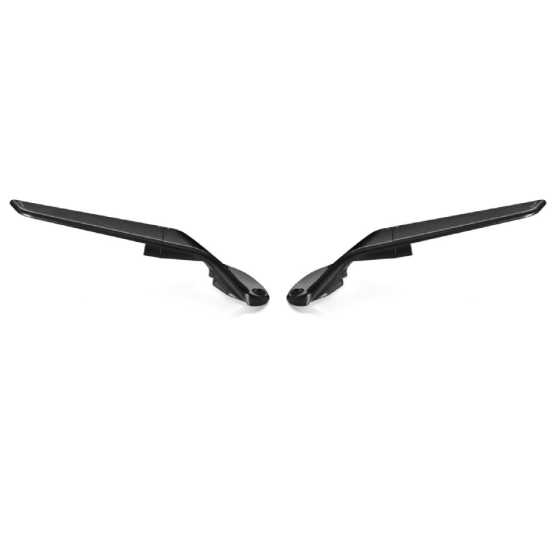 Two elements: a fixed base integrated into the fairing and a movable body that houses the glass. With a single motion, the structure compacts, transforming the mirror into an aerodynamic wing. The result: tangible downforce, up to 4 kg at 300 km/h. Milled from a single block of aluminum and finished with deep anodization, it features a convex HD blue-tinted lens for a sharp, glare-free view.