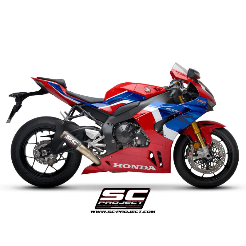 The CR-T muffler is the the unmistakable signature of the Racing style of SC-Project. Multiple Moto2 World Champion was created to satisfy the best Teams and Riders. Designed and developed to give a sporty and racing character to your Honda CBR1000RR with a deep and dark Sound is unique in the aftermarket silencer panorama. The iconic muffler is available in variants Titanium or Carbon . To achieve the best performance the CR-T is built with materials derived from the aeronautical industry, such as Titanium or Carbon fiber with dedicated treatment to withstand the highest temperatures. Bracket welding and fitting with T.I.G. technology. The insert bushings are all in Titanium machined from solid by CNC machines, wich guarantee impeccable couplings. In the kit is included the link pipe in full titanium with T.I.G. welding.