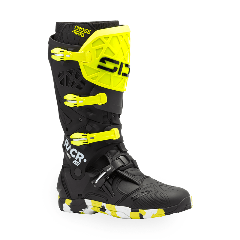 All the support, control and protection without the extra burden. Crossair X delivers an outstanding level of safety, with highdensity impact protectors covering the entire boot in a light and flexible structure engineered to perform. The sole, powered by Materiis compound, has been developed for the control and durability needed in a Supercross championship: the result is an endless level of total grip to tackle every circuit. Internally, a fiberglass exoskeleton provides support during jump landing, and a 3-point anti-hyper-flexion system protects from dangerous movements.