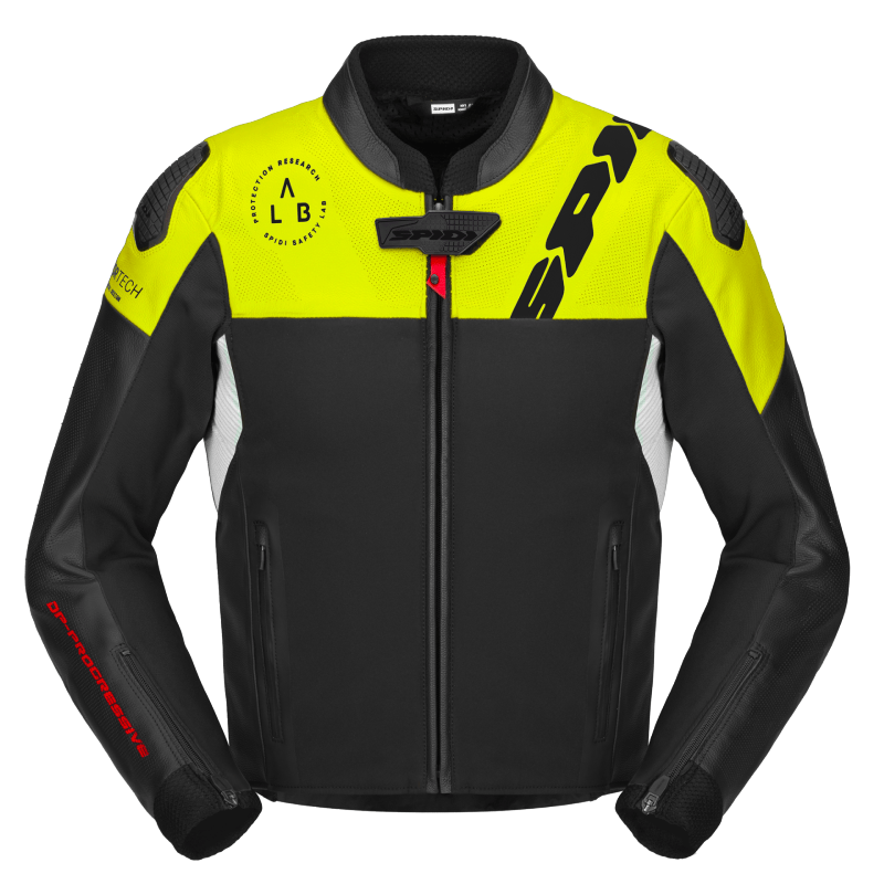SPIDI DP Progressive Hybrid leather jacket: the ultimate racing jacket delivering maximum ventilation and protection to sport bikes riders. The full grain cow leather – 1.1 to 1.2 mm – has been lightened with localized perforation, to guarantee direct ventilation and significantly reduce the weight. The main multi-way elastic softshell panels on front and back further increase the level of comfort while riding in hottest climates. The total weight of the jacket results to be around half a kilogram less if compared to a traditional racing leather jacket.