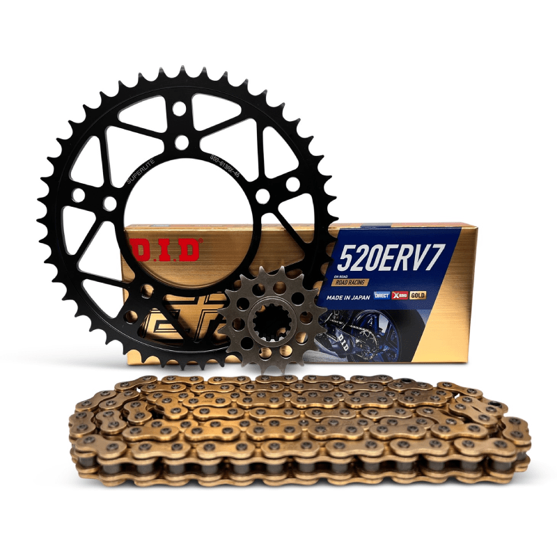 Superlite RSX Series steel sprocket kits shave unsprung “rotating” weight which in turn provides better acceleration, braking and handling. All kits include high quality RSX Series sprockets with multiple gear ratio options and high strength D.I.D. X-Ring sealed chains cut to length. These championship winning sprocket kits are extremely strong and built to last!